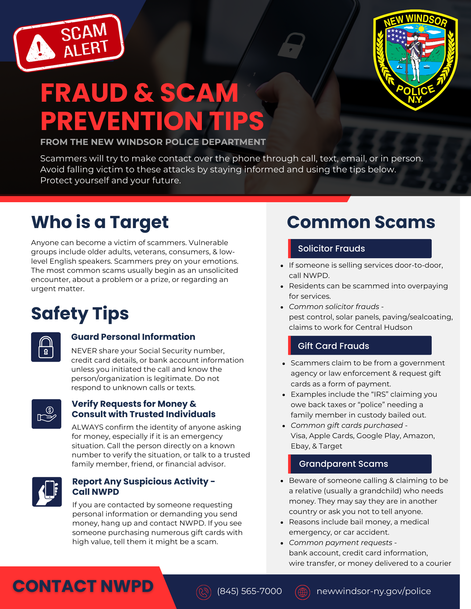 If you believe you may be in contact with someone who is attempting to defraud you, cease contact and call the Town of New Windsor Police Department at (845)565-7000.